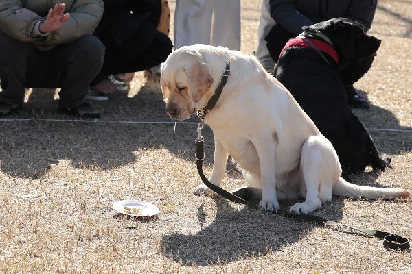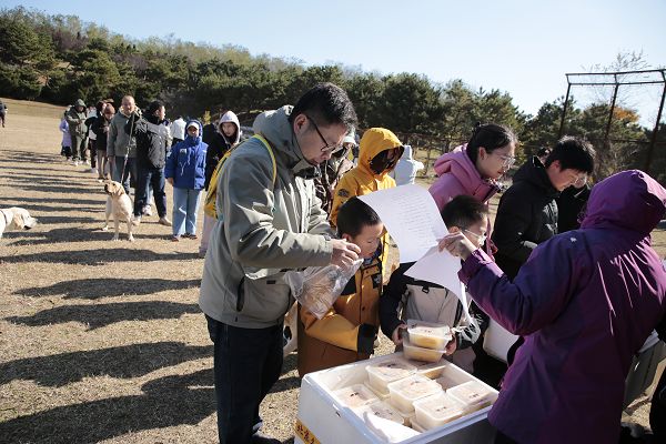 随后的午餐环节,基地为寄养家庭准备了水果和菜饼等美味餐食。然而,导盲犬们的午餐则需通过“自控力考验”才能获得。在美食和寄养家庭呼喊的诱惑下,导盲犬需保持静坐,末位走出指定圈子的犬只为获胜者,并获得罐头奖励,其余犬只则食用常规犬粮。这一环节不仅考验了导盲犬的服从性和专注力,也展现了寄养家庭平日训练的成果。